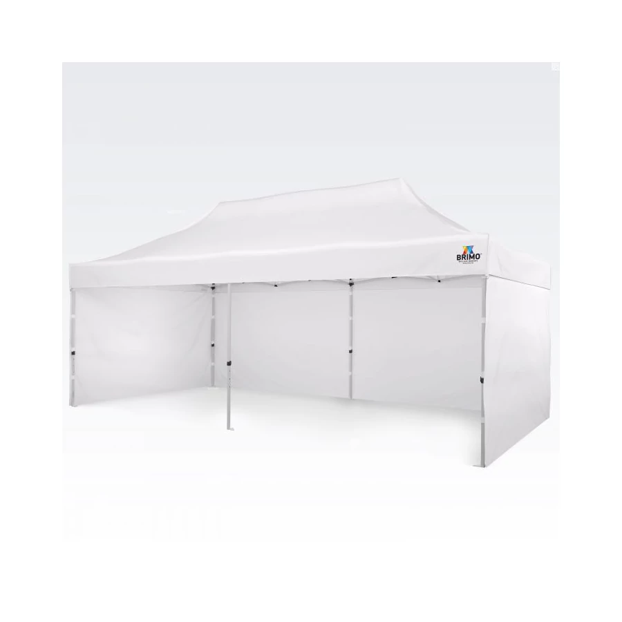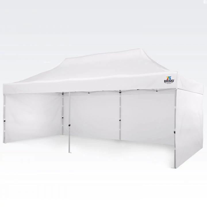 A fehér oldalfalak védelmet nyújtanak az időjárás ellen, miközben rendezett összképet adnak. A sátor rögzíthető sátorsúllyal vagy leütő szöggel, a helyszín adottságaitól függően. Opcionálisan esőcsatornával és világítással is felszerelhető. Több darab összeépítésével nagyobb fedett terület is kialakítható.